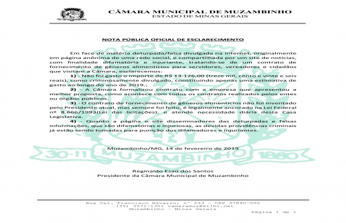 Em face de matéria deturpada/falsa divulgada na internet, originalmente em página anônima de uma rede social, e compartilhada por um site de notícias, com finalidade difamatória e injuriante, tratando-se de um contrato de fornecimento de gêneros alimentícios para servidores, vereadores e cidadãos que visitam a Câmara, esclarecemos: