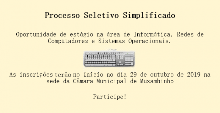 A Câmara Municipal de Muzambinho fará um Processo Seletivo Simplificado para contratação de estagiário na área de Informática, Redes de Computadores e Sistemas Operacionais.