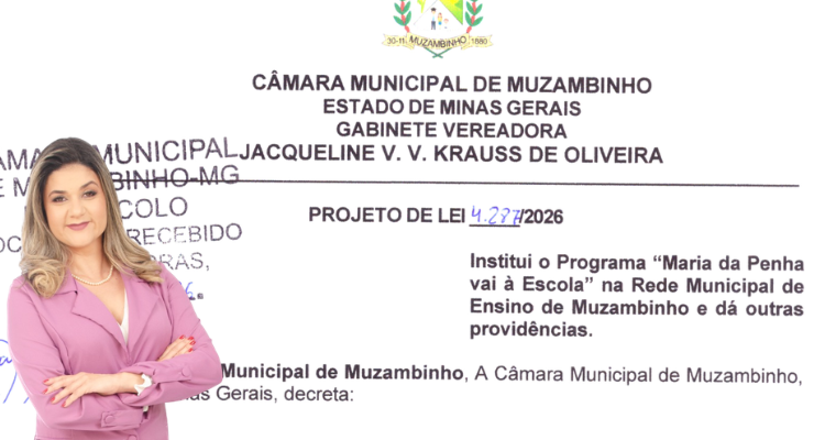 A Câmara Municipal de Muzambinho aprovou em primeiro turno, na reunião realizada no dia 30 de março de 2026, o Projeto de Lei de autoria da vereadora Jacqueline Vechi Vilela Krauss de Oliveira, que institui o Programa “Maria da Penha vai à Escola” na Rede Municipal de Ensino.