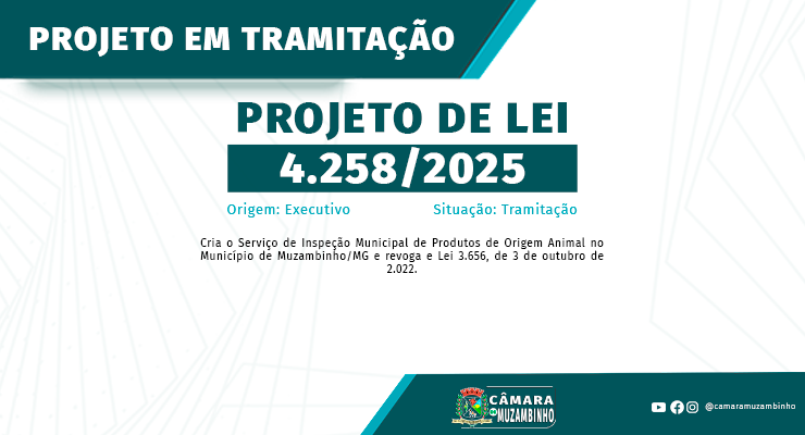 Câmara Municipal de Muzambinho está analisando o Projeto de Lei nº 4.258/2025, de autoria do Poder Executivo, que cria o Serviço de Inspeção Municipal de Produtos de Origem Animal no município!