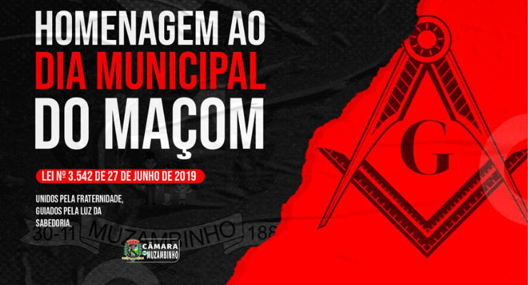 A Câmara Municipal de Muzambinho realizará, em Sessão Solene, uma homenagem ao Dia Municipal do Maçom , instituída pela Lei nº 3.542, de 27 de junho de 2019, de autoria do vereador Dr.